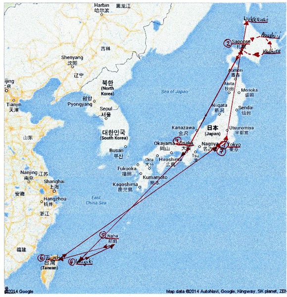 Wie immer hat Knut unsere Japanreise akribisch geplant und vorbereitet. Wir werden über Tokyo an der Ostküste in der Mitte Japans nach Hokkaido, der nördlichsten Insel reisen, von dort nach Osaka wieder in die Mitte, diesmal jedoch im östlichen Teil, von dort auf die südlichste Inselgruppe nach Ishigaki. Diesmal müssen wir etwas Zickzack reisen, um dann über Naha einen Abstecher nach Taiwan machen zu können. Von dort geht es dann zurück nach Tokyo und Frankfurt. Die Reise wird insgesamt 32 Tage dauern.