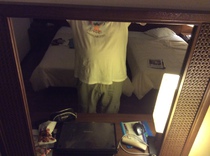Nicht nur die Räume sind kleiner als in Europa, auch die Normen für den Innenausbau sind offenbar anders. Dies zieht nach sich, dass rasieren und frisieren vor dem Spiegel nur mit einer Verbeugung machbar ist (dies entspricht natürlich durchaus japanischer Höflichkeit). Hier ein Bild mir der "Normalsituation". Dafür gibt es eine sehr gute Wiedergabe der "Bauchpartie" - aber das Schaubild an "zuviel davon" muss nicht jeden morgen auf nüchternen Magen sein.