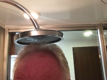 Unter der Dusche gibt es ähnliche Verhältnisse. Die Situation "Wannendusche" will ich gar nicht beschreiben, dieses Bild zeigt den Superluxus einer begehbaren Dusche mit Schwallbrause, aber der Schwall hat keine Chance mehr sich auszubreiten - zwischen Austritt und Kopf weniger als eine Daumenbreite , da wird es mit der Shampoonierung echt eng. (kein "Trick" ich bin barfuss)