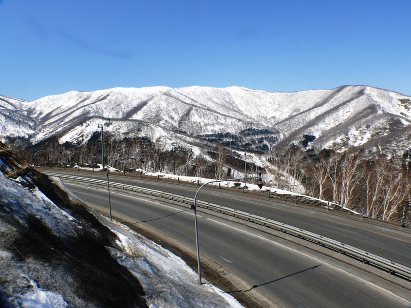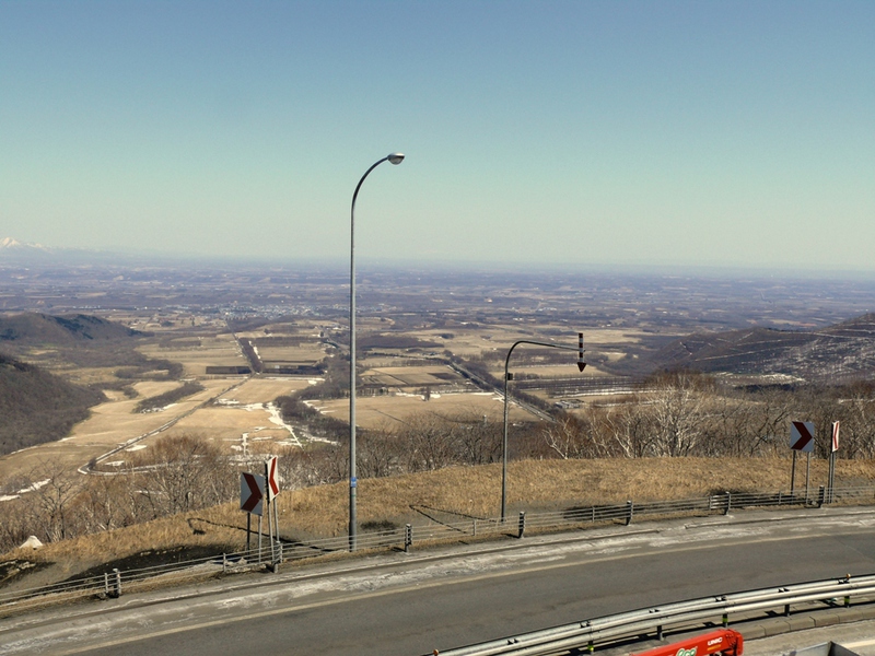 Die Nationalstraße ‚274’ windet sich hinauf zum ‚Nissho Pass’. Von der Passhöhe, die selbst auf der Kuppe einer kleineren Kaldera liegt, ist die große Kaldera, die heute die Ebene zwischen den Bergen bildet, gut erkennbar.