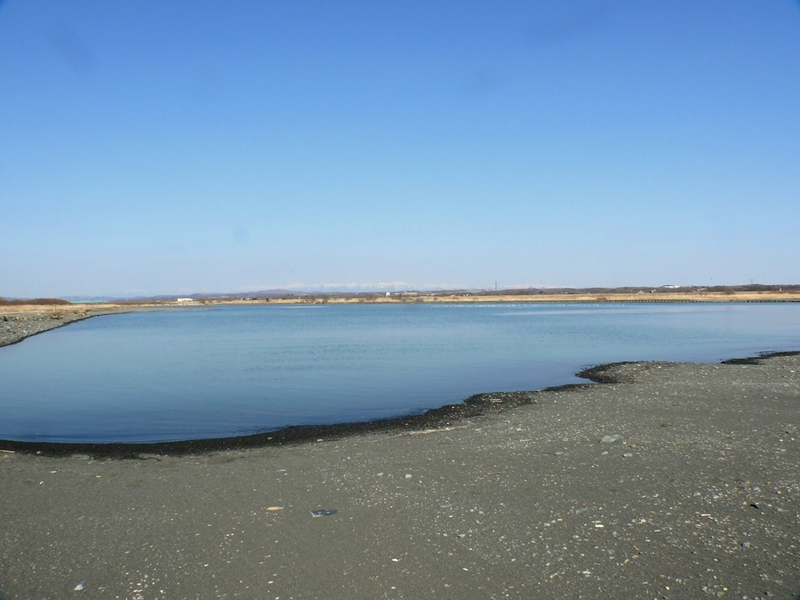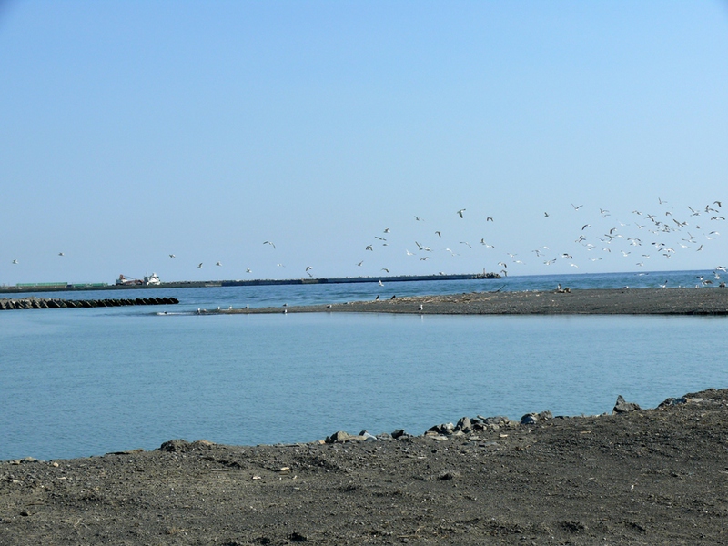 ....und fahren dann weiter am ‚Saru River’ entlang bis zur Mündung in den Pazifik bei ‚Tomikawa’. Die Mündung liegt auf der gleichen geografischen Höhe wie die Mündung des Chetco River in Oregon/USA, die wir bei unserer Reise "Nordwest"Passage" besucht haben, und zwischen hier und da liegt nur Pazifik-Wasser. Die "Kälteprobe" ist angenehm, obwohl noch mit kaltem Gebirgswasser vermischt, etwa gefühlte 20°C. Sonst ist nichts zu sehen, außer einem Schwarm Seemöwen.