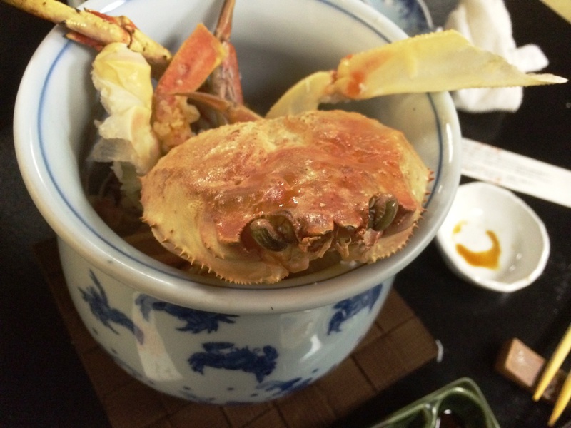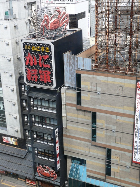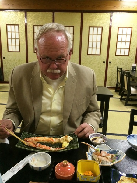 Am Abend genießen wir "Monsterkrabben" im Restaurant gegenüber, ein „Muss“ für die Abrundung eines Japan- Besuches. Am Eingang gibt man seine Schuhe ab und wird dann per Lift in die 3. Etage befördert. Serviert wird hier im traditionellen ‚Kimono’. Die Krabben sind super, allerdings etwas beschwerlich beim „Auspulen“ (wie man in Hamburg sagt), vor allem so ganz ohne Messer und Gabel. Vom (ausschließlich) angebotenen "Hokkaido-Wein" raten wir: "lass es"....