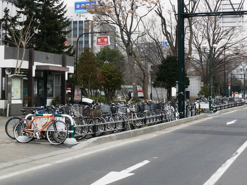 Zwei Straßenblocks weiter ragt der ‚Sapporo TV Tower’ 147m in die Höhe. Da es relativ diesig ist und zwischendurch auch immer mal etwas nieselt, sehen wir allerdings davon ab, auf die Aussichtsplattform hinauf zu fahren. Auch dieser Turm aus dem Jahr 1957 ist dem Eiffelturm nachempfunden.... Überall in Japan wird sehr viel Fahrrad gefahren. Es gibt in den Städten überall – wie auch hier – abschließbare (kostenpflichtige) Parkständer.