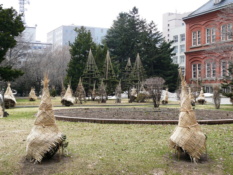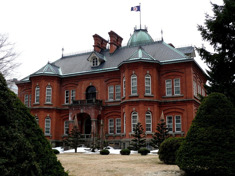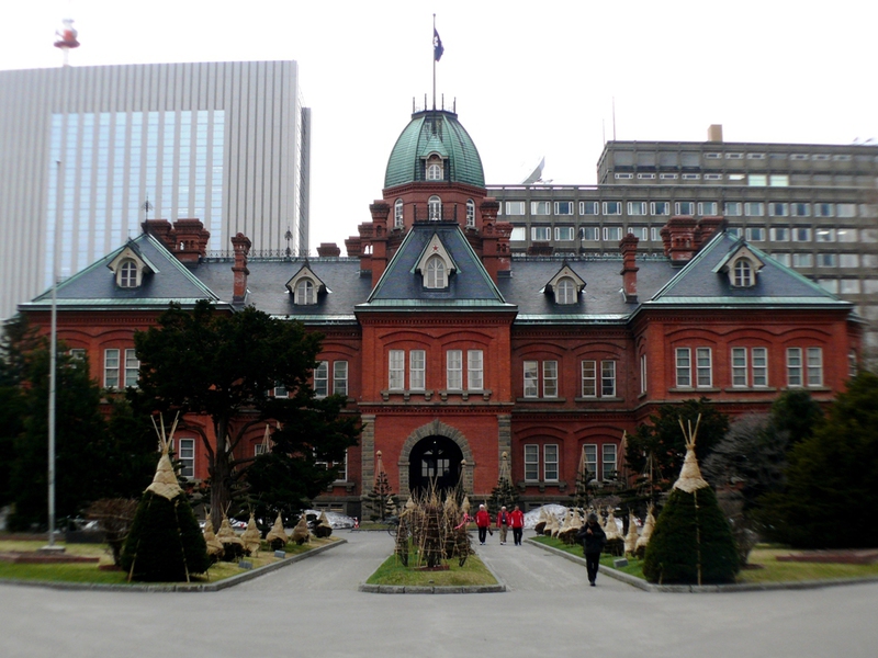 Eines der beliebtesten Gebäude in ‚Sapporo’ ist das ehemalige Hokkaido Regierungsgebäude aus dem Jahr 1888‚ im Volksmund genannt ‚Akarenga’, was ‚Roter Ziegel’ bedeutet. Hier ist den Fachleuten der Stadtverwaltung ein Bauwerk mal ausgesprochen gelungen.... Das zur damaligen Zeit eines der größten Gebäude Japans wurde 1911 nach einem Brand wieder rekonstruiert. Es liegt eingebettet in einen kleinen Park – die Bäume und Sträucher tragen noch ihren ‚Winterschutz’....