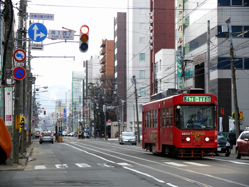 Den größten Teil der ‚Sapporo-Highlights’ haben wir nun gesehen und lassen uns daher einfach ein wenig durch die Straßen treiben – meistern einen schwierigen ‚Baustellen-Parcours’, bewundern das neueste Rennrad-Modell, studieren eine uns häufig in Japan begegnete Fußstellung, entdecken, dass es noch eine alte Straßenbahnstrecke gibt..