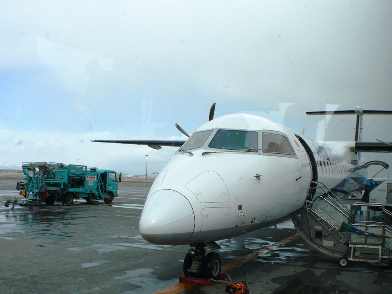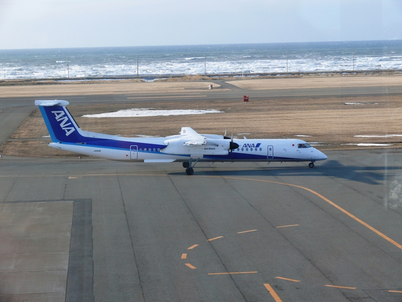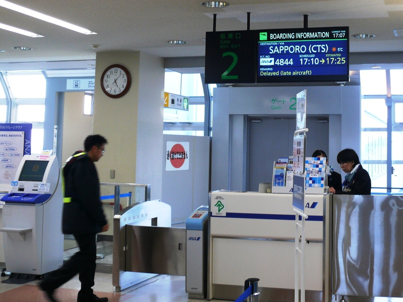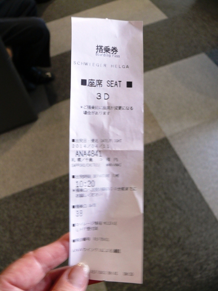 So beginnen wir - gut ‚gefrühstückt’ - unseren Tagesausflug nach ‚Wakkanai’, dem nördlichsten Zipfel Japans. ANA (All Nippon Airways) gehört der ‚Star Allianz’ an, und so ohne Gepäck geht alles ganz schnell und reibungslos und die Bordkarten für den Rückflug am Spätnachmittag werden gleich mit ausgestellt. Die Bordkarten sehen allerdings eher wie ein Supermarkt-Bon aus... Unsere kleine Propellermaschine ist nur spärlich besetzt und daher – aber auch wegen großer Beinfreiheit – sehr bequem. Mit 15 Min. Verspätung heben wir dann um 10:35h endlich ab.