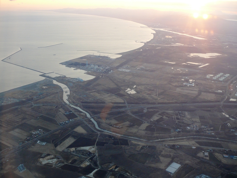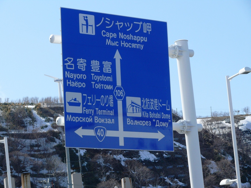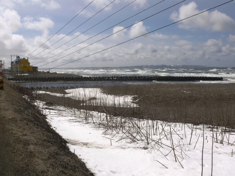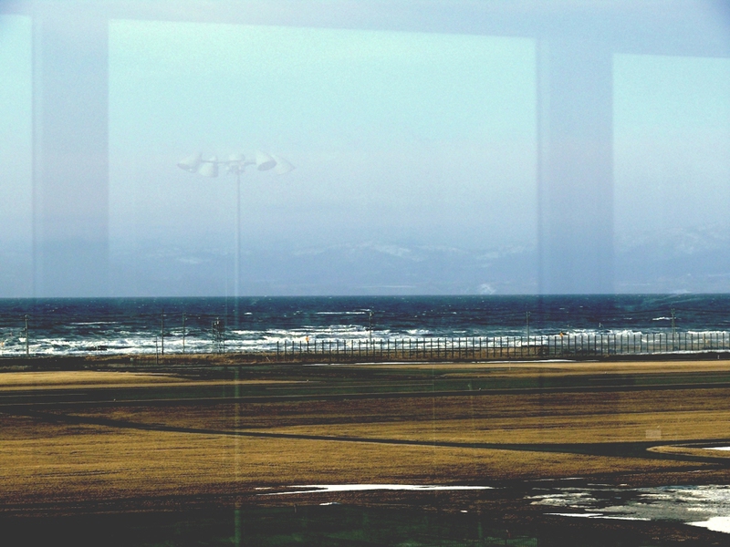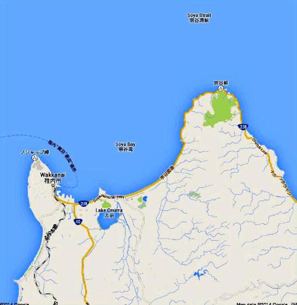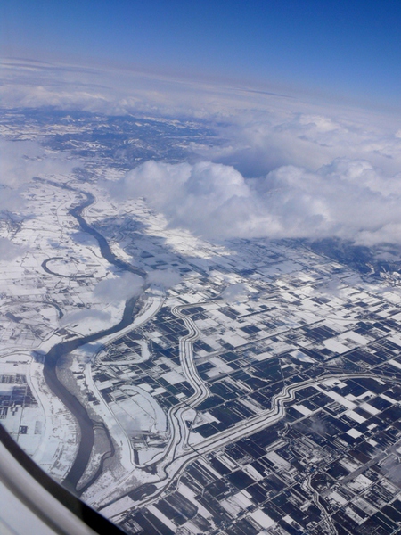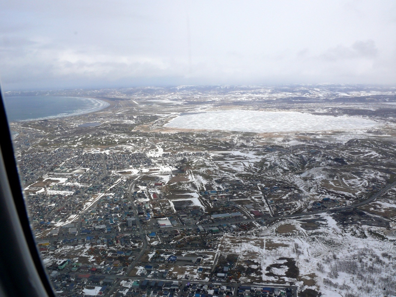 Die Landschaft zeigt sich – je nördlicher wir kommen – mit immer größeren Schneeflächen, und nach einer knappen Stunde überfliegen wir ‚Wakkanai’ und ‚Cape Noshappu’ und können dann hinter dem noch zugefrorenen ‚Lake Onuma’ am Ende der sichelförmigen Soya-Bucht den nördlichsten Zipfel Japans bereits ausmachen. Nur 43km ist die ‚La-Pérouse-Strait’ hier breit, die Japan und Russlands größte Insel ‚Sachalin’ voneinander trennt.