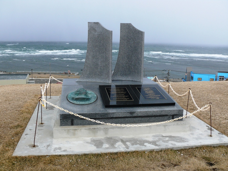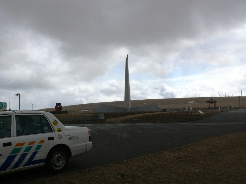 Unser Fahrer entwickelt sich ausgesprochen nett und fährt uns – an der Absperrung vorbei - auf die Anhöhe, das eigentliche Kap, mit weiteren "Highlights": u. a. ein Wegweiser – nach ‚Grenoble’ 10639km, nach ‚Anchorage’ 4645km – , sowie eine Gedenkstätte für den Seefahrer, Weltumsegler und Geograf des 18. Jh.‚Jean-François de Galaup de La Pérouse’, nach dem die Strasse zwischen ‘Hokkaido’ und ‚Sachalin’ benannt wurde: 'La-Pérouse-Strait'.