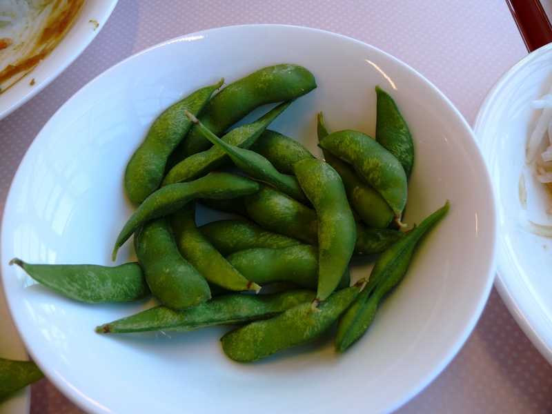 Wir entlassen unseren netten Fahrer und bestellen im Flughafen-Restaurant, was die Speisekarte für uns so hergibt. Spannend für uns sind vor allem die ‚gekochten Sojabohnen’ – das kennen wir noch nicht. Sehen aus wie Erbsenschoten, lassen sich auch so öffnen, und darin befinden sich die Bohnen. Schmeckt ganz gut.