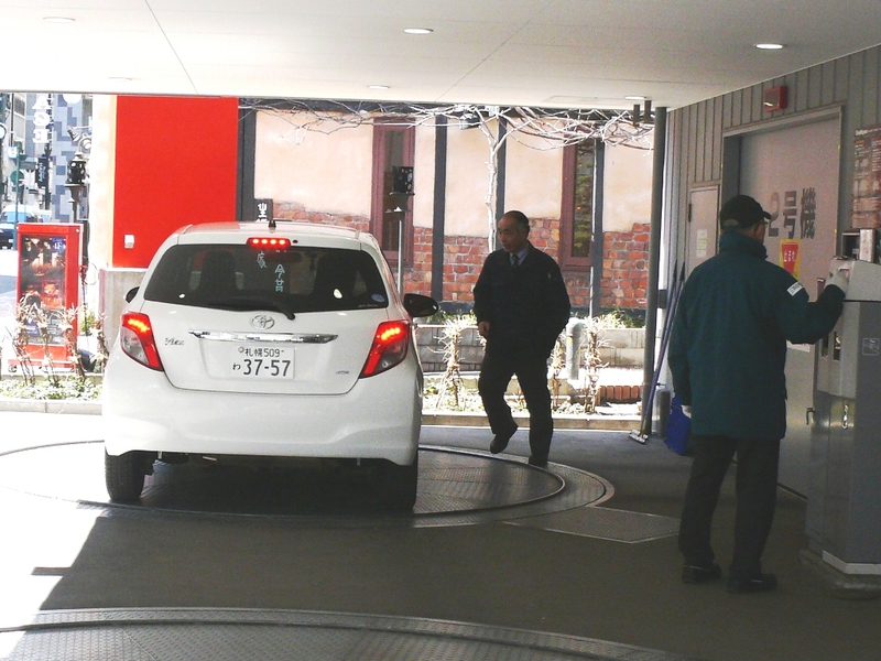 Die Hotelgarage funktioniert wie ein Bienenstock: das Auto wird parallel zum Gebäude auf einen Teller gefahren, der Teller dreht sich und man kann in eine kleine ‚Wabe’ einfahren, dann verschwindet sie mitsamt Auto irgendwo im Gebäude – sehr platzsparend, da keine Rampen benötigt werden... Innerhalb 2 Minuten kann das Auto wieder abgerufen werden: beladen, einsteigen, ausfahren – fertig.