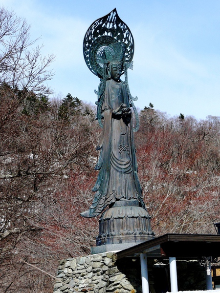 Bei ‚Fukugawa’ verlassen wir die Schnellstraße und wechseln auf die '12’, die entlang des 'Ishikari River' verläuft. Bei ‚Kamuy-kotan’ erzählt die Legende von 'Nitnekamui', einer bösen Gottheit, die von ‚Samayunkur' dem guten ‚Wächtergott' besiegt wurde. Einzelne Felsen und Formationen tragen Namen wie 'Fußabdrücke des bösen Gottes', 'die Narben des bösen Gottes vom Schwert des Wächters’ oder 'Kopf' bzw. 'Kiefer' des 'Nitnekamui’. Dem guten ‚Samayunkur' wurde dagegen ein Denkmal gesetzt...