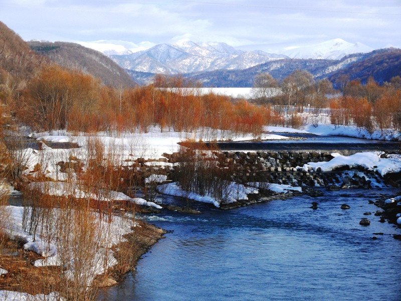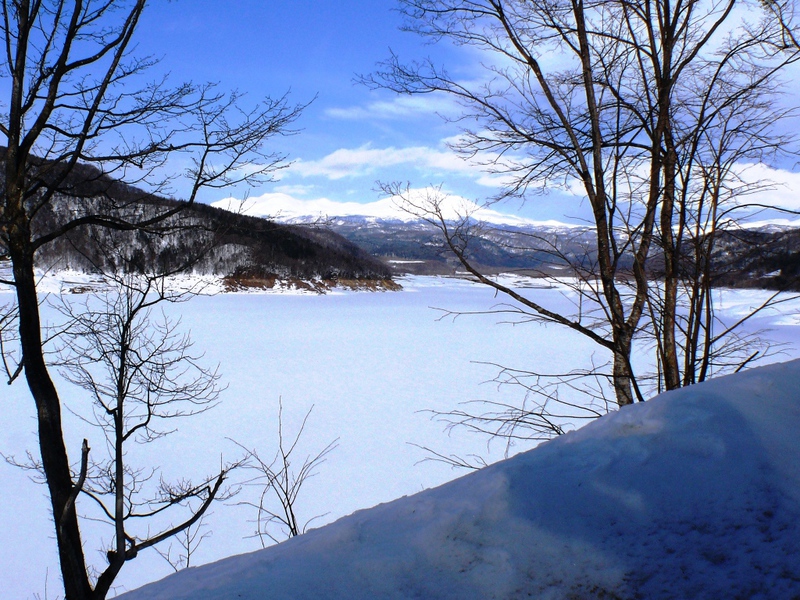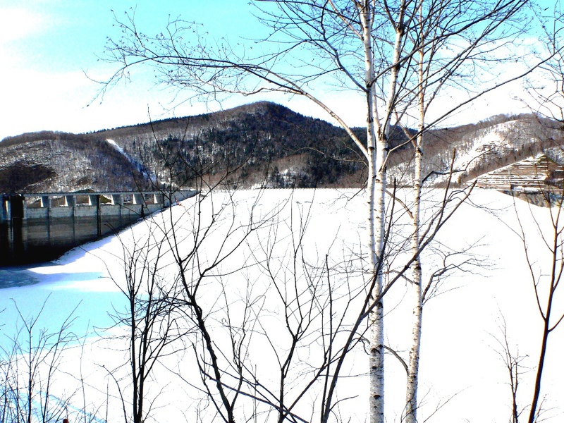 Die ‚213’ führt vorbei am 'Chubetsu Stausee' - Staumauer und See sind noch total verschneit .