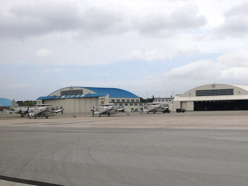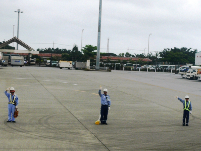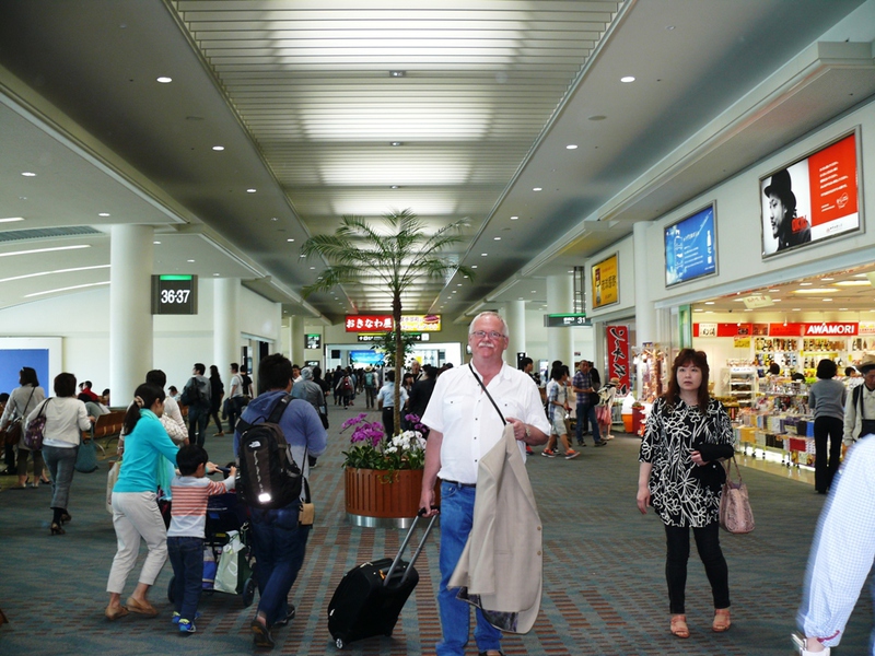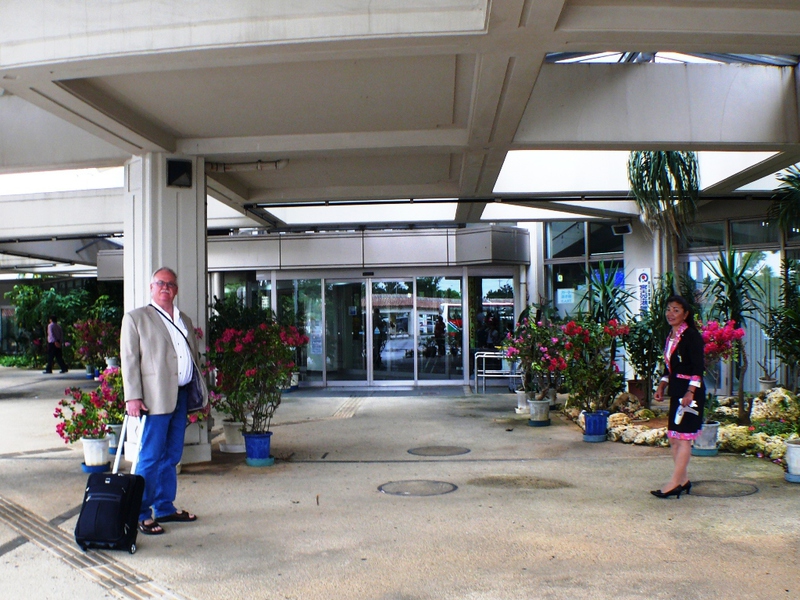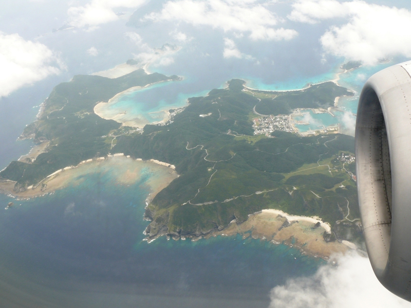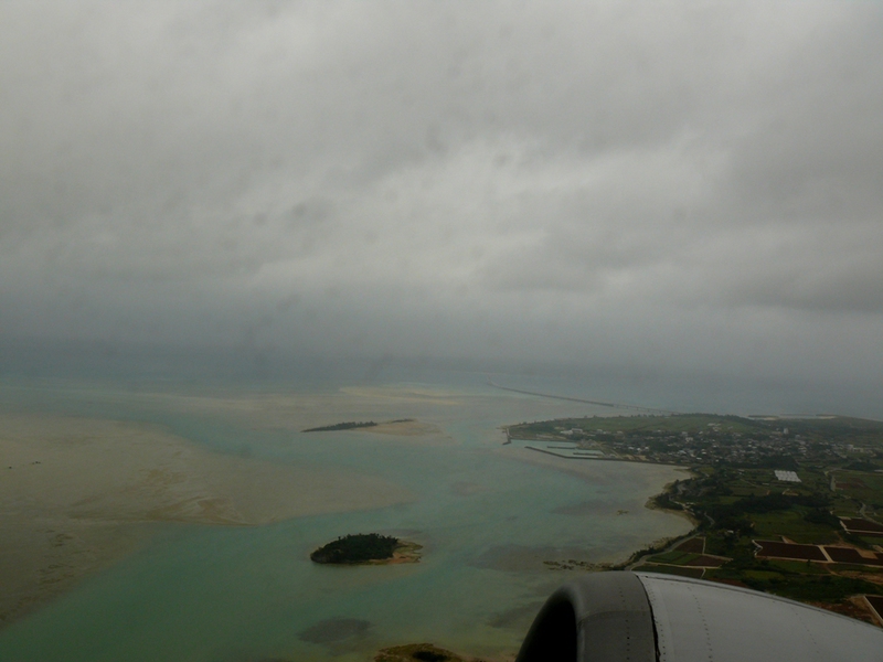 Schlechtes Wetter, Null-Sicht und ein volles Flugzeug bringen den kleinen Mann in der Reihe vor uns nicht von seiner guten Laune ab, und es ist ja auch bei nur 30 Minuten Flugzeit auszuhalten. Um 11:52h überfliegen wir die ‚Okinawa’ vorgelagerte Insel ‚Zamami’ und in einer weiten Rechtskurve nehmen wir Kurs auf den Flughafen von ‚Naha’ auf der Hauptinsel.