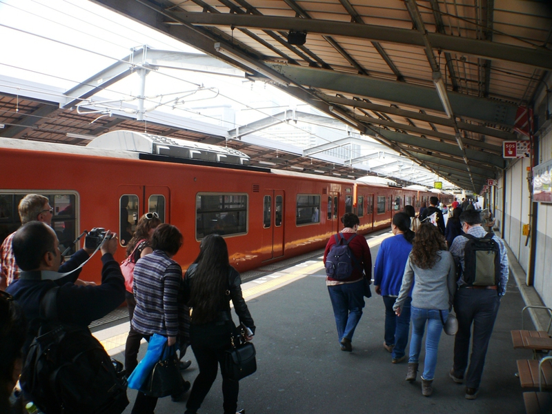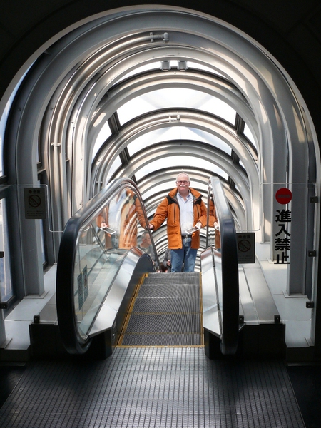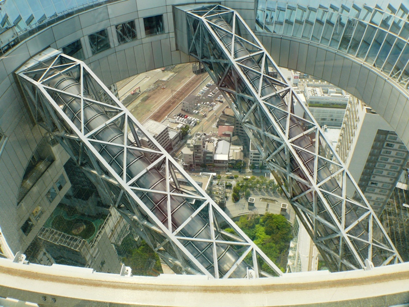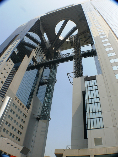 Es ist schon erstaunlich, wie 'Yukuma' von JTB-'Sunrise Tours' ihre 27 ‚Schäfchen’ zur Herde formt und heil durch das Gewusel des Bahnhofs zum Nordausgang leitet. Von hier haben wir bereits unser erstes Ziel im Blick: das 'Umeda Sky Building', zwei Hochhäuser, verbunden durch einen ringförmigen Überbau in 173m Höhe – für einen Rundgang an frischer Luft mit 360°-Blick auf die Stadt.
